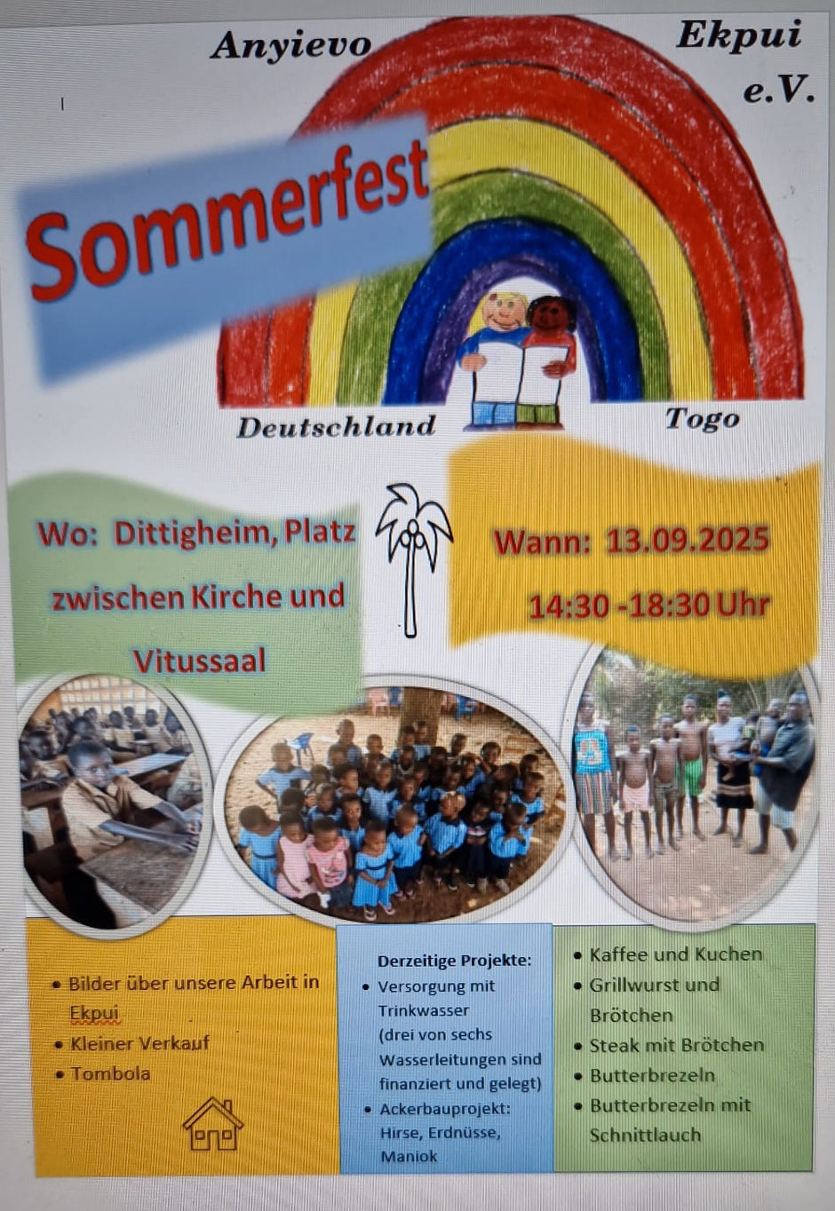 Tauberbischofsheim-Dittigheim. Nach drei Jahren Pause findet am Samstag, 13. September, von 14.30 bis 18 Uhr wieder das Sommerfest des Vereins Anyievo-Ekpui statt. Jetzt mit neuem Standort auf dem Platz zwischen Kirche und Vitussaal (Rathausplatz 2, 97941 Tauberbischofsheim-Dittigheim). Das Fest des Vereins, der sich für Hilfe zur Selbsthilfe für ein Dorf in Togo stark macht, findet zum achten Mal statt. Es gibt zu essen und zu trinken, gute Unterhaltung, Geselligkeit, eine Tombola sowie den Verkauf von schönen Dingen aus verschiedenen Ländern. Der Erlös soll dem Projekt "Trinkwasser für alle Einwohner in Ekpui" zu Gute kommen. Drei von sechs benötigten Leitungen für das Dorf konnten schon bezahlt werden. Mehr über das Projekt: https://www.anyievo-ekpui.com/